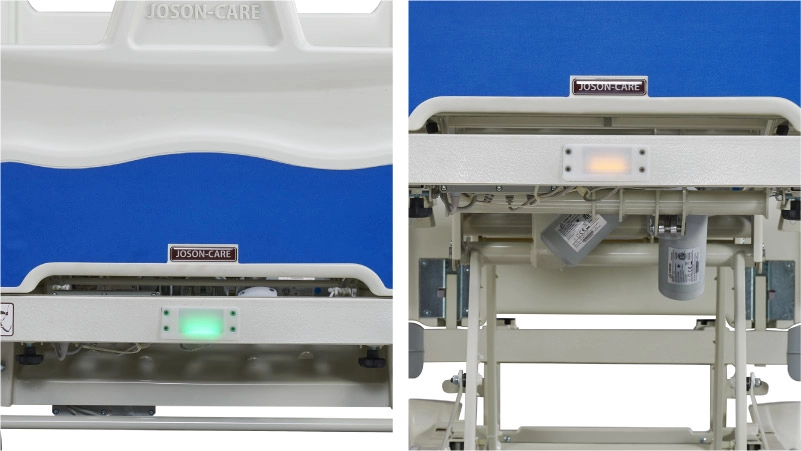 床尾配置高度警示燈,當床體升降時會亮起不同顏色的警示燈,清楚提醒病患與醫護人員。煞車警示燈