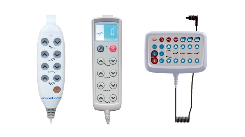 除床體護欄與床尾的操作面板外,亦可選配手持操作器,將原有面板功能延伸至可移動式設計。另提供液晶手控器,以及手持式床尾操作器,讓照護操作更靈活便利。 -