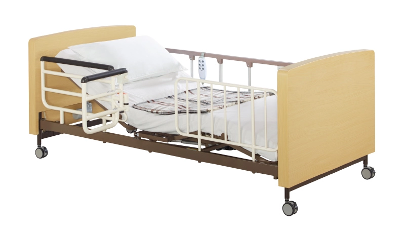 依照護需求架設於床體側邊,可選擇外開角度輔助患者站立以便離床或是與床身平行以保護患者躺臥在床上時避免滑落床下。插式護欄