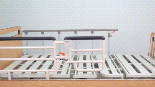依照護需求架設於床體側邊,可選擇外開角度輔助患者站立以便離床或是與床身平行以保護患者躺臥在床上時避免滑落床下。插式護欄(選配)