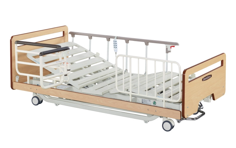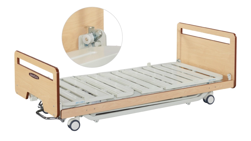 ES-18UDS 提供貼近地面的超低床高設計,降低跌落風險,特別適合高齡長者與術後使用者。 為提升使用靈活性,搭載中控煞車系統與特製床尾板,方便照護者輕鬆踩踏穩固煞車與移動床體,進行日常護理。可拆式床頭尾板