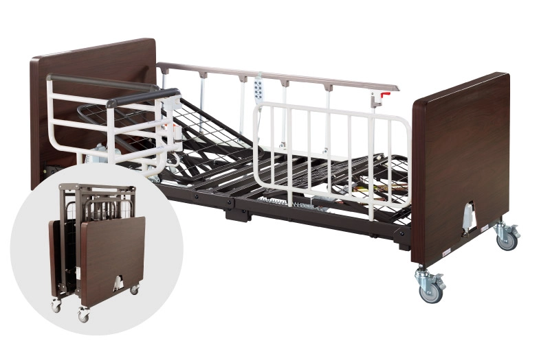 依照護需求架設於床體側邊,可選擇外開角度輔助患者站立以便離床或是與床身平行以保護患者躺臥在床上時避免滑落床下。插式護欄
